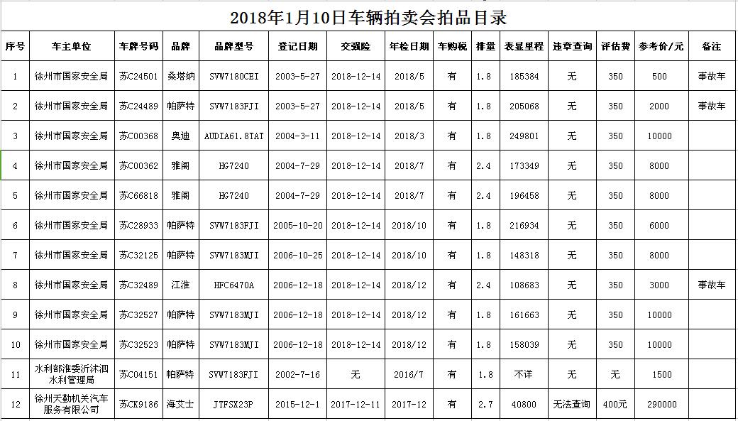 關(guān)注微信公眾號(hào)我公司受委托,定于2018年1月10日10時(shí)在徐州市中山南路55號(hào)三樓本公司拍賣大廳公開(kāi)拍賣各型汽車11輛。主要有帕薩特6輛、雅閣2輛、奧迪1輛、桑塔納1輛、江淮1輛。