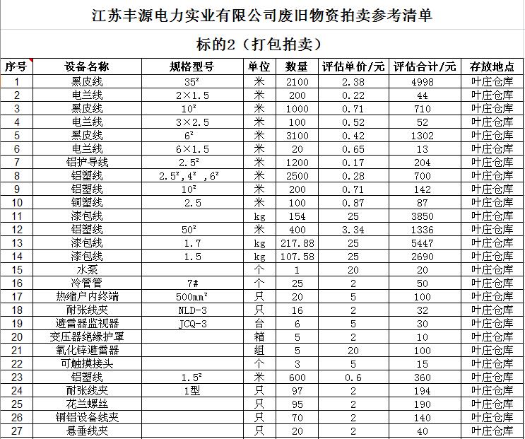 關(guān)注微信公眾號(hào)受江蘇徐供集體資產(chǎn)運(yùn)營(yíng)中心委托,我公司將通過(guò)中國(guó)拍賣行業(yè)協(xié)會(huì)網(wǎng)絡(luò)拍賣平臺(tái)以網(wǎng)絡(luò)競(jìng)價(jià)的方式分兩批公開拍賣其下屬三家集體企業(yè)廢舊物資,主要包括:廢舊電纜、纜芯、鋼帶、導(dǎo)線、開關(guān)、電表、金具、廚房設(shè)備等(詳見拍品目錄)。