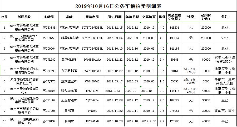 關(guān)注微信公眾號受委托,我公司定于2019年10月16日13:00時(shí)在徐州市銀地二手車交易市場四樓東南拍賣大廳通過現(xiàn)場和汽車街網(wǎng)絡(luò)拍賣平臺同步進(jìn)行的方式公開拍賣以下公務(wù)車輛: