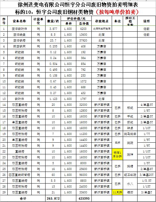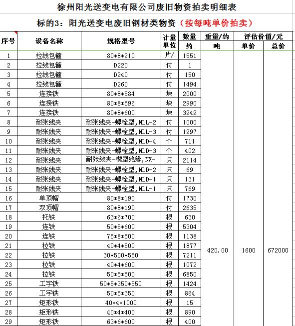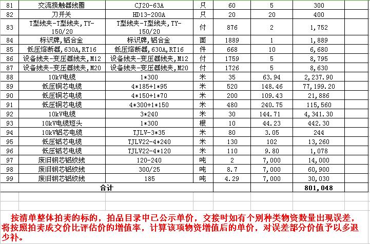關(guān)注微信公眾號(hào)受委托,我公司將通過(guò)中國(guó)拍賣行業(yè)協(xié)會(huì)網(wǎng)絡(luò)拍賣平臺(tái)以網(wǎng)絡(luò)競(jìng)價(jià)的方式公開(kāi)拍賣以下公司廢舊電力物資。主要包含:廢銅排下腳料、廢不銹鋼、辦公設(shè)備等;架空絕緣導(dǎo)線、電纜、金具、角鋼塔、鋼芯鋁絞線、開(kāi)關(guān)、互感器、變壓器散件等。
