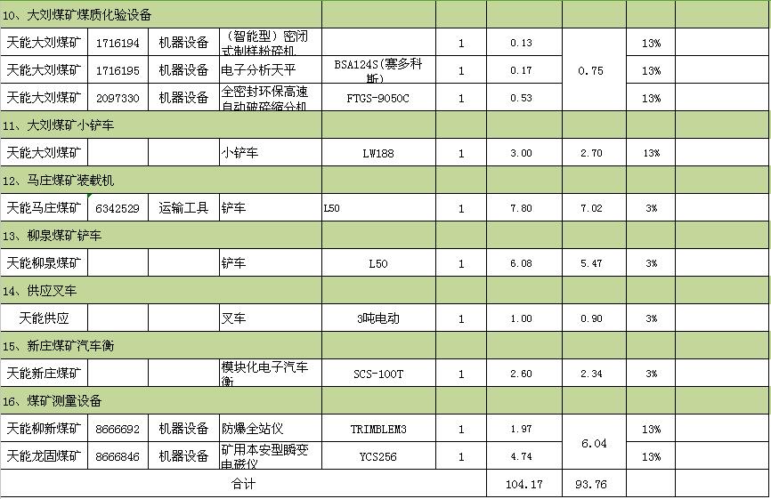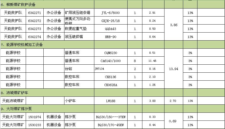 裝載機、通風機、綜掘機、變壓器、鏟車、叉車、排沙泵、汽車衡、繪圖儀、救護設備、機械加工設備、測量設備等。