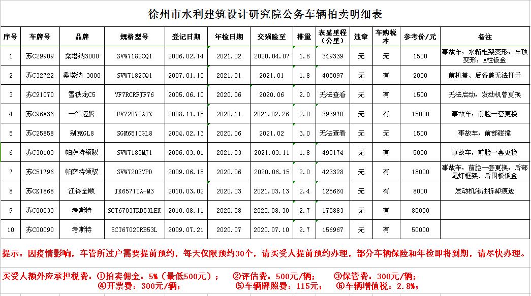 關(guān)注微信公眾號受委托,我公司定于2020年4月1日13:00時在徐州市銀地二手車交易市場四樓東南拍賣大廳通過現(xiàn)場和汽車街網(wǎng)絡(luò)拍賣平臺同步進行的方式公開拍賣:徐州市水利建筑設(shè)計研究院公務(wù)車輛10輛,主要車型有帕薩特、桑塔納、雪鐵龍C5、邁騰、全順、GL8、考斯特等。