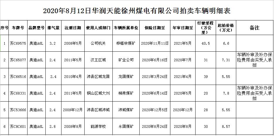 關注微信公眾號受委托,我公司定于2020年8月12日14:00時通過中拍平臺和現(xiàn)場結合方式公開拍賣:華潤天能徐州煤電有限公司奧迪公務車6輛。
