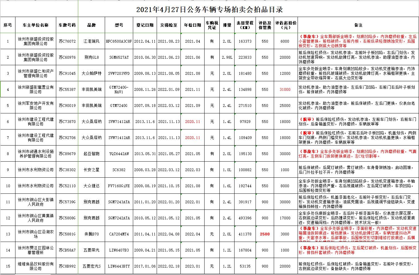 4月22日、23日在徐州中山飯店停車場及徐州銀地二手車交易市場展示。有意競買者請持有效證件到我公司辦理報名手續(xù),并交納每輛車1萬元保證金即可參拍,報名截止至4月26日16時。