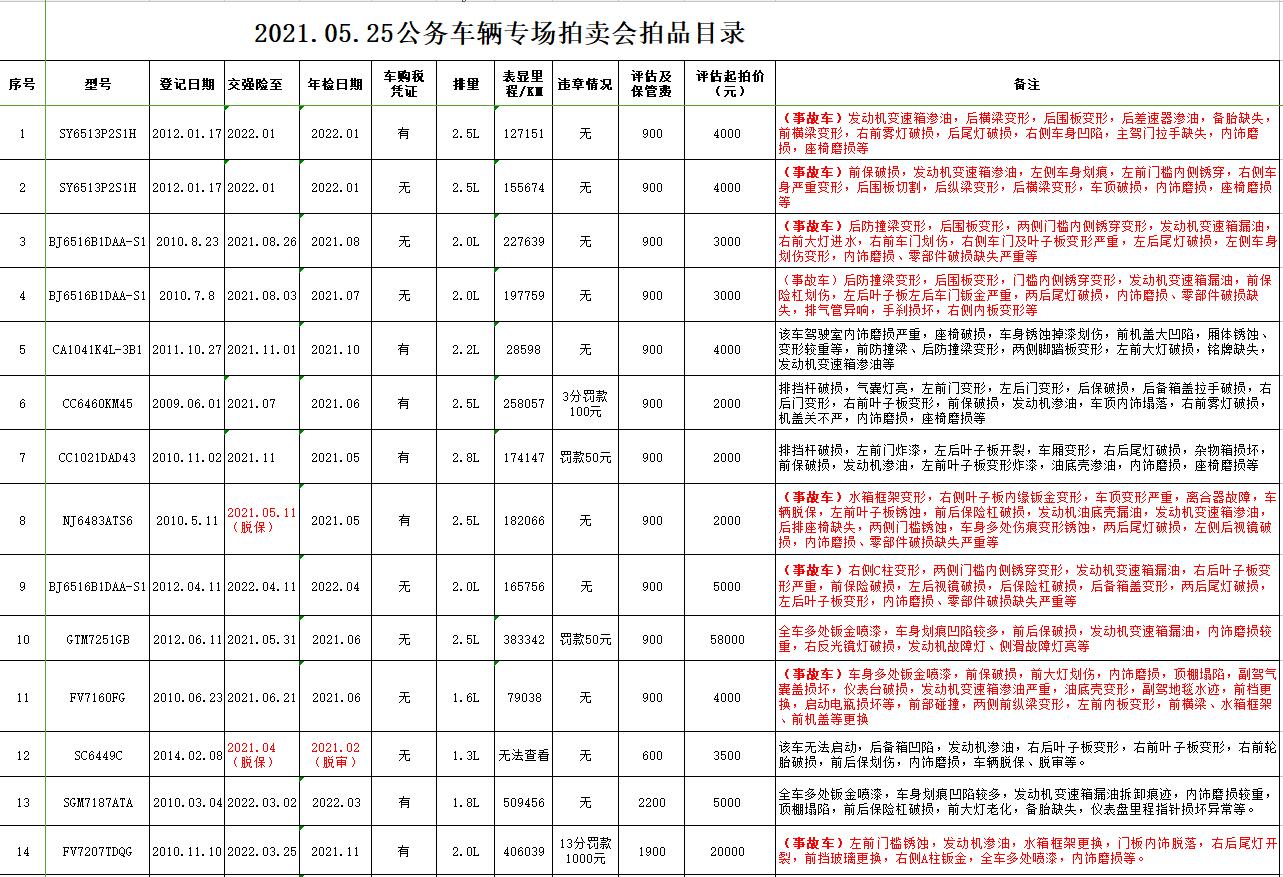 受委托,我公司定于2021年5月25日10時(shí)在中拍平臺(tái)通過網(wǎng)絡(luò)競(jìng)拍方式公開拍賣以下公務(wù)車輛: